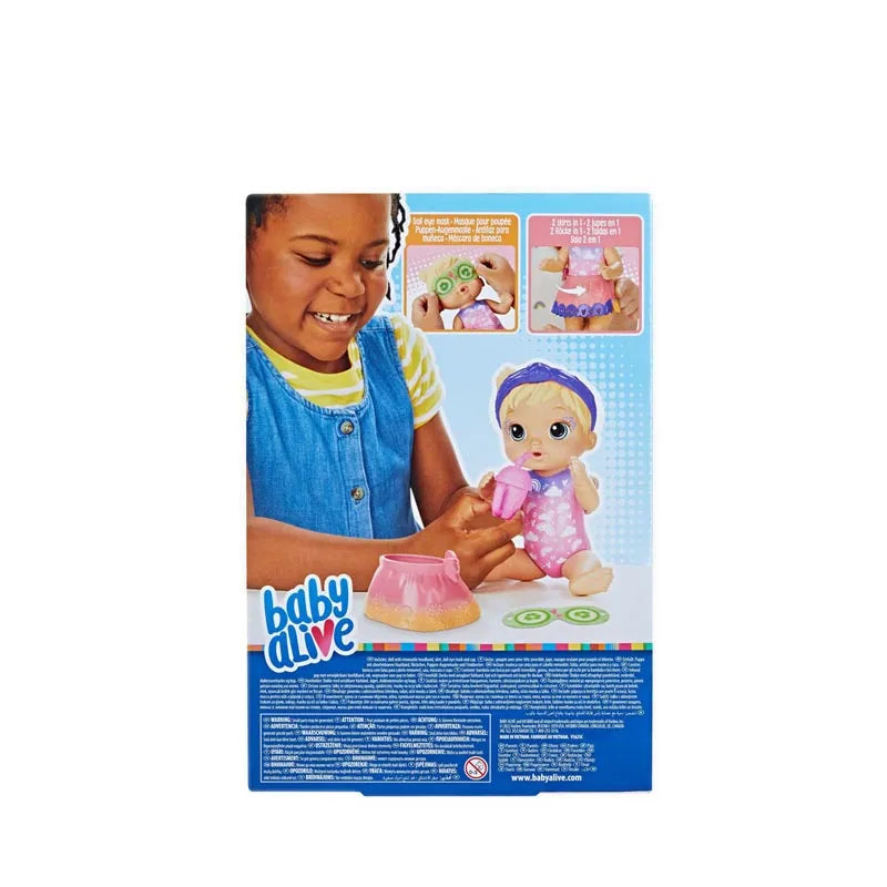 SPA-THEMED DOLL: Kids ages 3 and up can treat Rainbow Spa Baby doll to a pretend spa day and put on her special doll eye mask CUCUMBER EYE MASK DOLL ACCESSORY: This 10-inch Baby Alive doll comes with an adorable doll eye mask that looks like 2 cucumbers 2 DOLL SKIRTS IN 1: Toy features a vibrant dual-sided skirt -- twist it around to reveal a new look REMOVABLE HEADBAND AND BOTTLE: Doll features a fun headband that matches her outfit and a play bottle so kids can pretend to feed her POSEABLE DOLL FOR Girls AND Boys: This doll with 5 points of articulation makes a great gift for birthday and holiday presents Includes doll with removable headband, skirt, doll eye mask and cup. Figure scale: 10 inches For ages 3+ Adult assembly required. WARNING: Small parts may be generated. NOTE: Adult should remove and discard fasteners. Surface clean only. © 2022 Hasbro. All rights reserved.