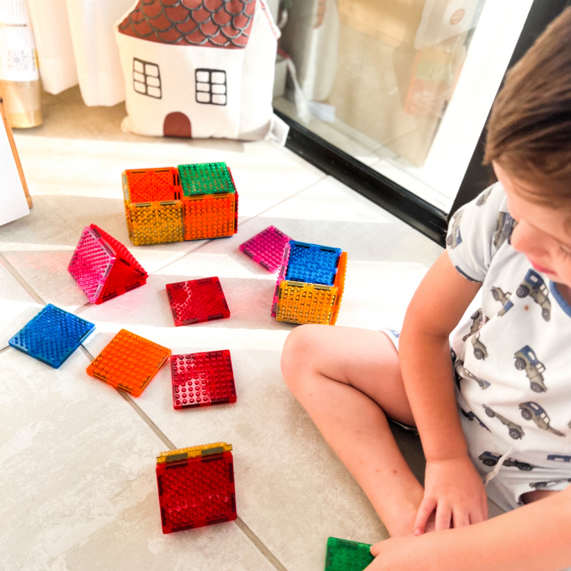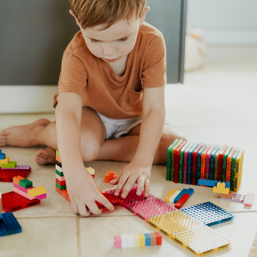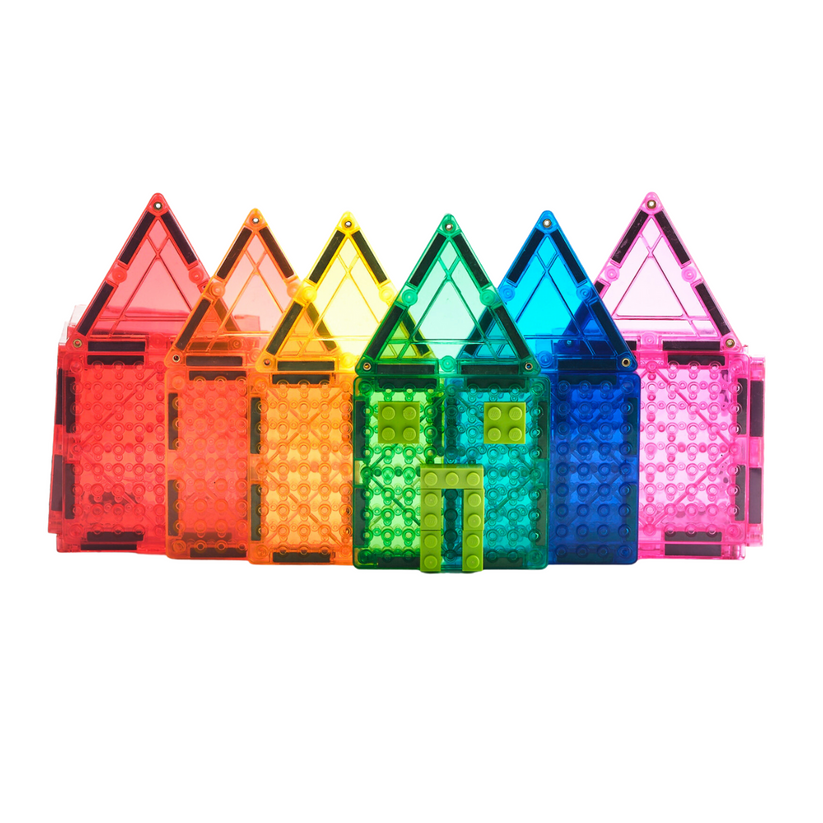 When you connect building bricks to Imagimags magnetic studded tiles, you bring them into the world of your Imagimags imagination and you experience the ultimate open-ended play!
