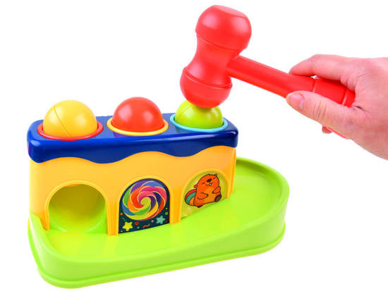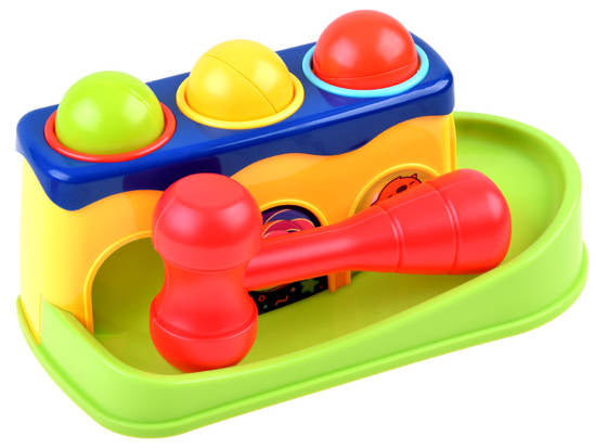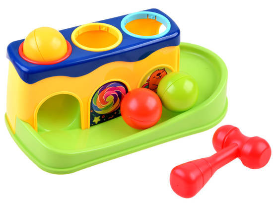 the colorful balls in the holes with a red hammer so that they fall down and roll down the slide. The product is made with the youngest children in mind,