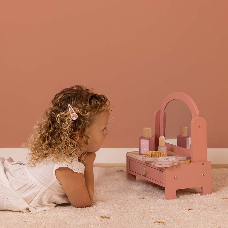Mirror, mirror on the wall. This wooden vanity table for kids is designed to encourage imaginative play.