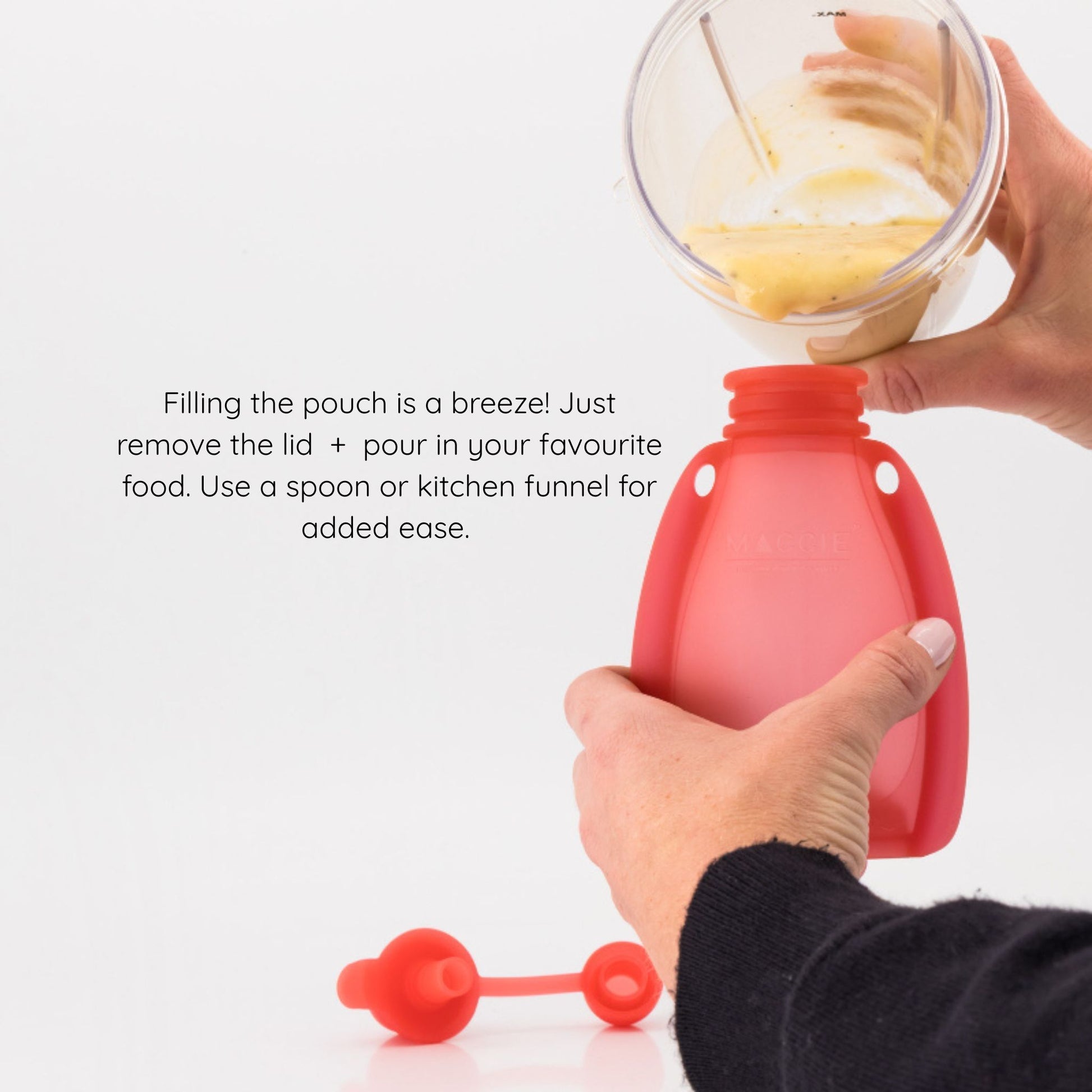 Introducing the NEW+ IMPROVED MACCIE squeeze + go silicone refillable food pouch with an anti-flow back valve! Now, your little one can enjoy delicious baby purees, nutritious smoothies, creamy yoghurt, or wholesome oats anytime, anywhere!
