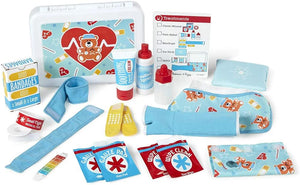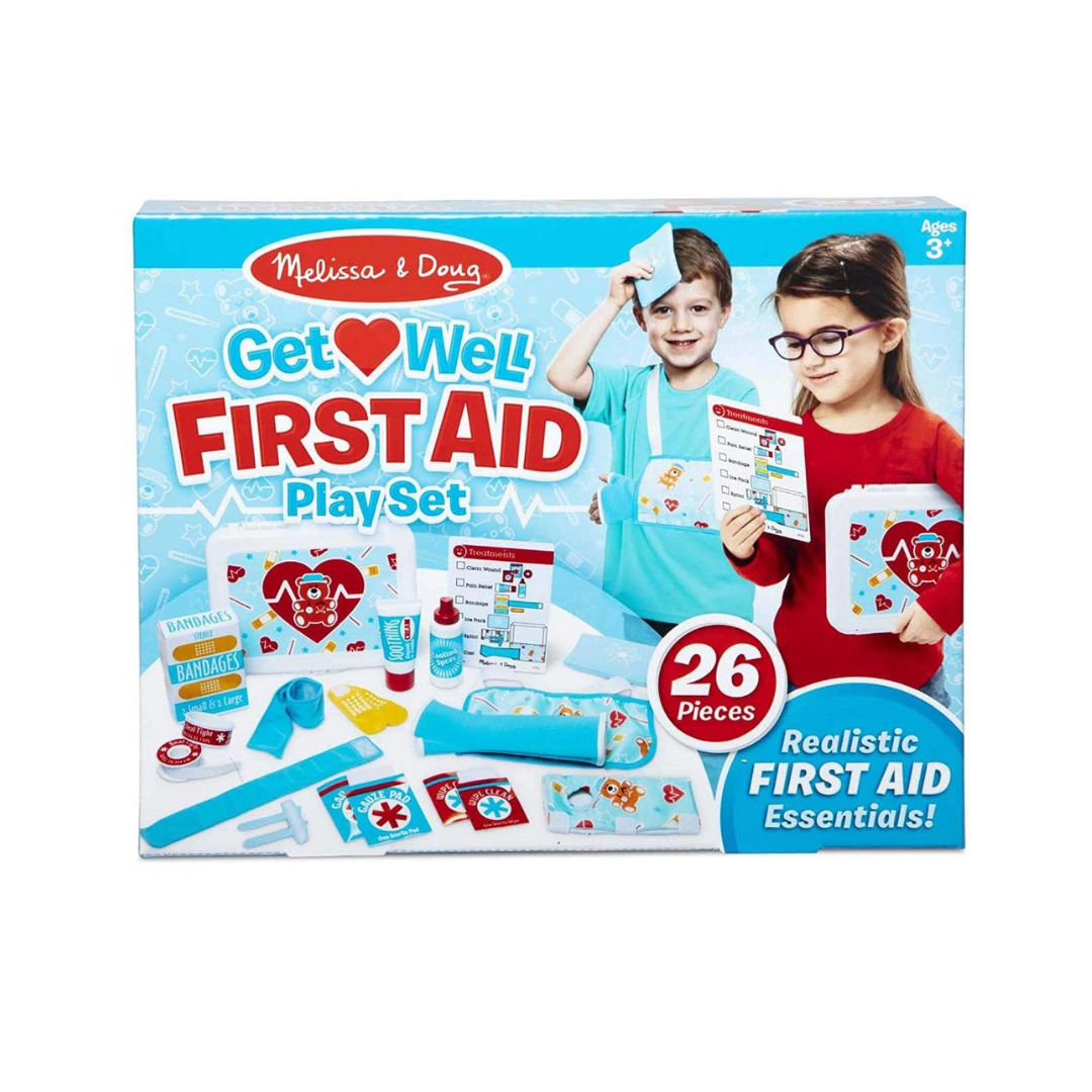 Be prepared to respond to pretend play emergencies! The 25-piece Melissa & Doug Get Well First Aid Kit Play Set offers realistic accessories let little healers help the injured get well! Kids three and older can pretend to set breaks and sprains with a wrist cast, splint, and sling, clean wounds with wipes and gauze, bandage boo-boos, and soothe ailments with pretend play tube, spray bottle, eye dropper, and ice pack. A reusable activity card lets kids keep track of their diagnoses and treatments. All the pieces store in the snap-shut first aid box for easy cleanup. The play set is a fun and engaging way to ease any feelings of stress associated with medical visits, and to encourage nurturing and empathetic play. Spark a child's creativity and imagination, and inspire young healers for years to come!