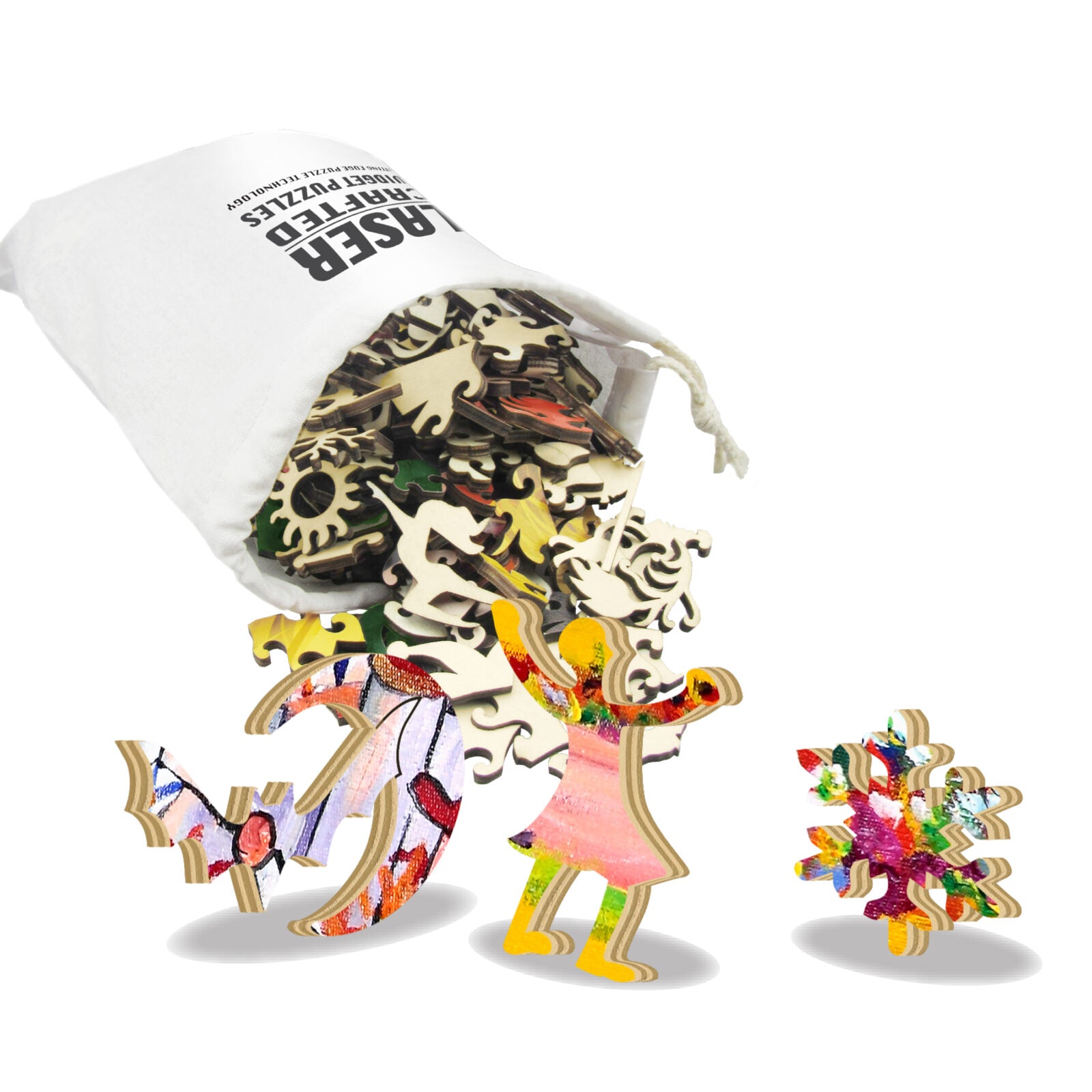 These unique and intricately crafted wooden puzzle pieces are laser cut to ensure smooth edges that fit perfectly together and every piece is different. The unique themed widget elements add a fun twist to building this puzzle. Extra thick wooden pieces ensure longevity for repeated handling. A material tote bag is included for easy storage of your puzzle pieces.
