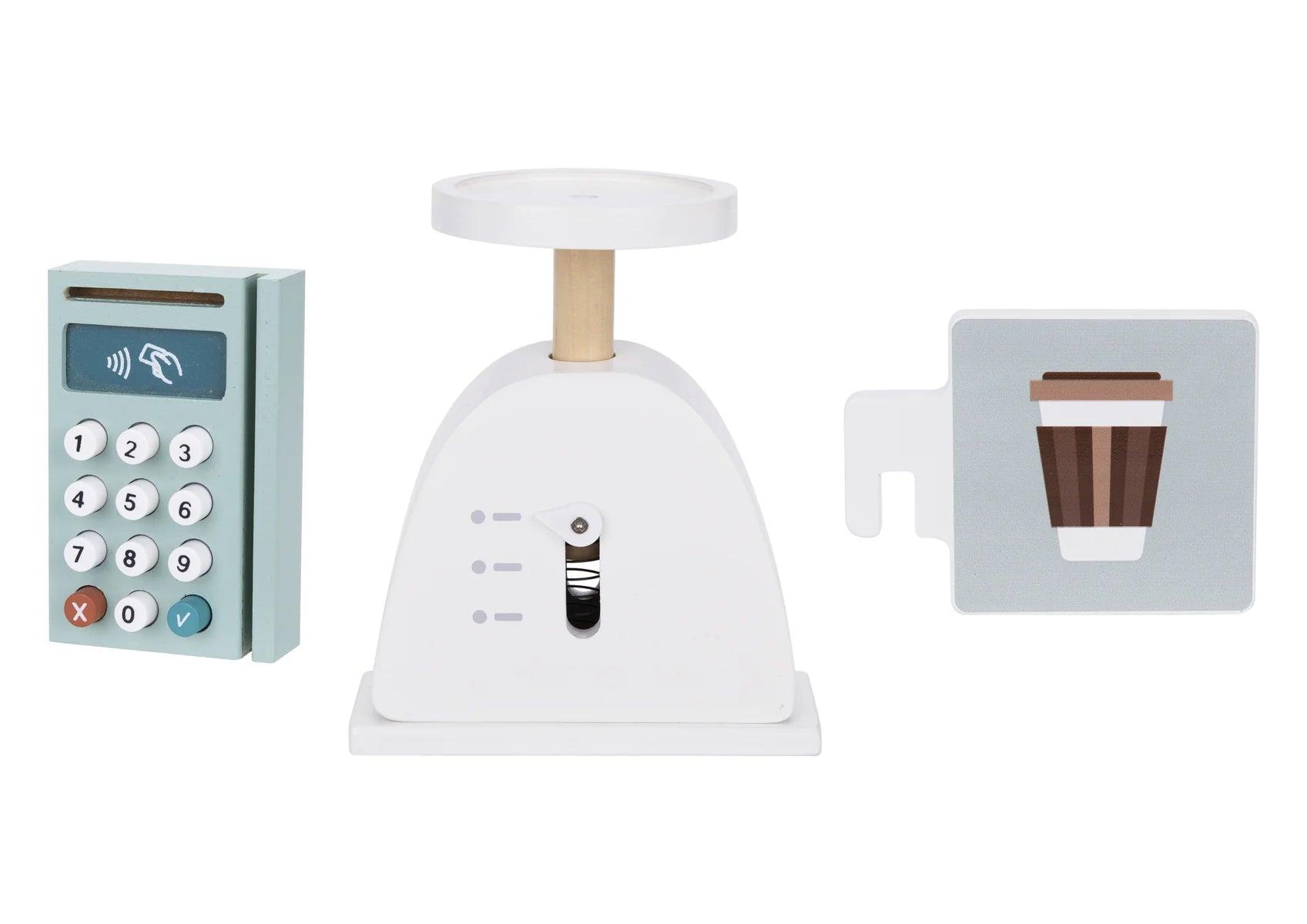 Wooden coffee cup, milk carton, weighing scale, credit card machine, play money (5, 10, 20, 100), credit card, receipts, cardboard shopping box