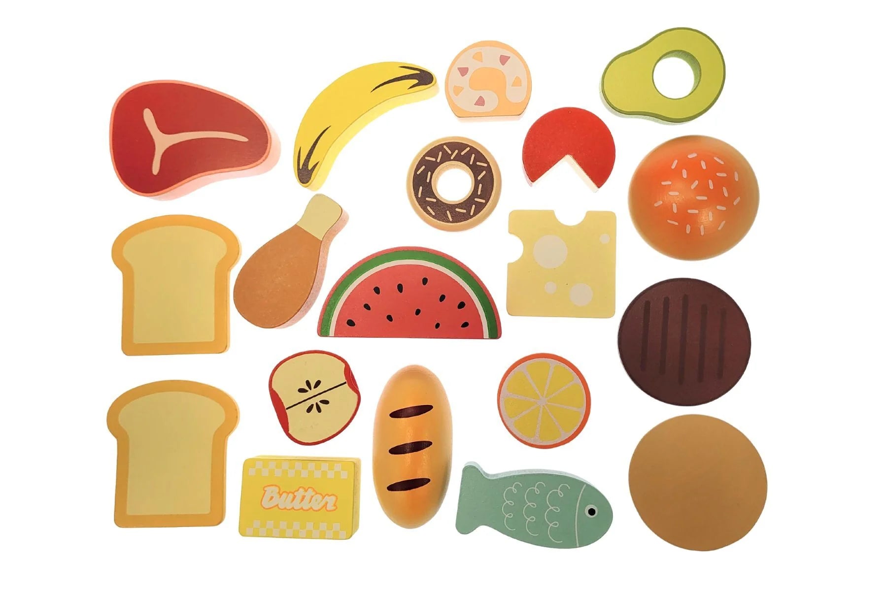 Fruits & veggies like apples, bananas, avocados, pineapples, grapes, watermelon and more Pantry & kitchen goodies including butter, cheese, bread, meats, donut, swiss roll slice, juice carton, candy box, sugar box & biscuits