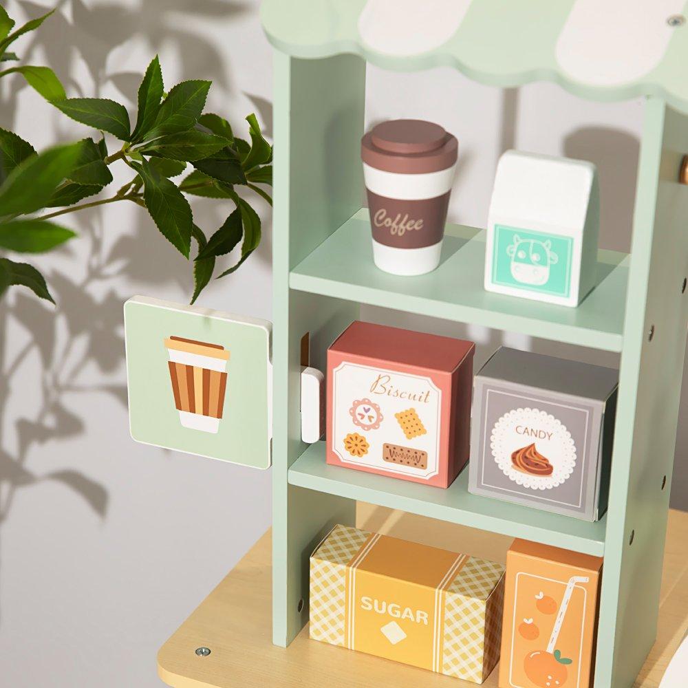 The set is bursting with the most adorable accessories—from a wooden coffee cup and weighing scale to play money, receipts, and a huge assortment of colourful wooden fruits, veggies, meats, and pantry goodies. With soft pastel tones and a sturdy wooden design, this charming play set is made to spark creativity and encourage hours of imaginative role play.